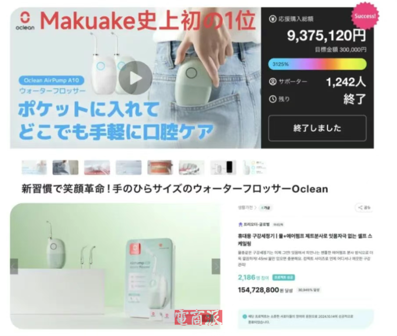 去年,Oclean冲牙器AirPump A10进入日韩市场,以众筹方式冷启动,还登上了当地最大众筹平台冲牙器类目榜一。
