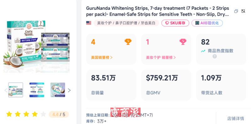 在旺盛的市场需求推动下,这些地区往往也更容易出现相关爆品。比如在TikTok Shop美区,口腔护理品牌GuruNanda的牙齿美白贴自去年爆火以来,产品销量持续攀升。