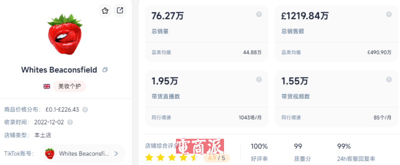 在TikTok Shop英区,品牌Whites Beaconsfield主卖牙齿美白相关产品,其明星单品牙齿美白贴2022年上线,至今依然爆火,单月销量上万件。截至目前,这家小店产品总销量已超76万件,累计销售额突破1200万英镑(约合1.2亿人民币)。