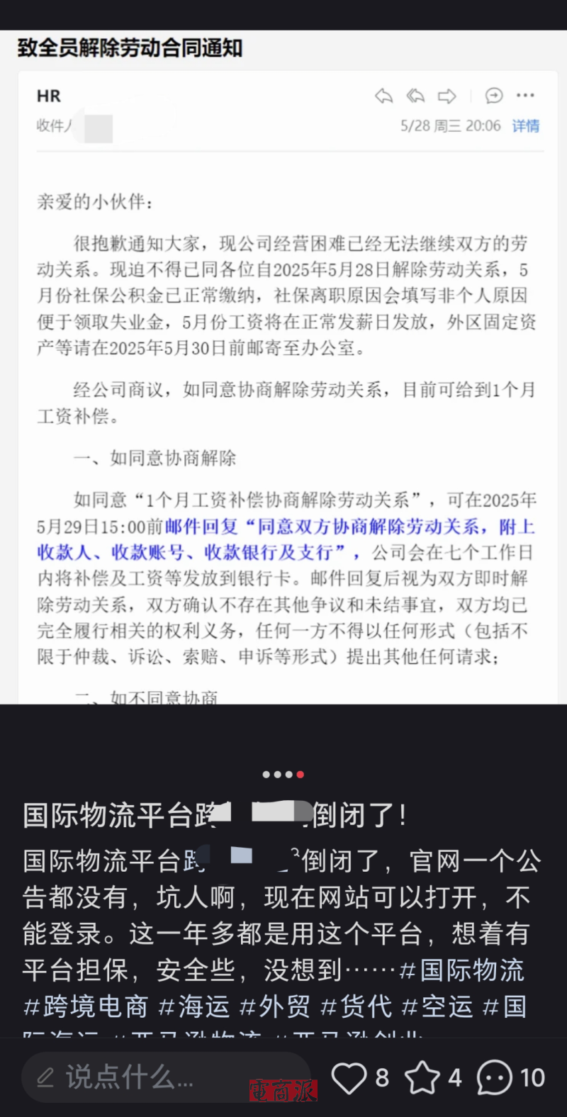 在跨境电商这个大圈子里,工厂倒闭这样的场景并非罕见,除了生产端的工厂面临困境,处于物流环节的货代公司也时常陷入危机,解散事件时有发生。