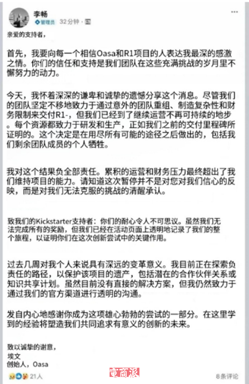 今年5月,该公司创始人在社交平台上发布公开信称,受团队意外重组、制造难题以及资金限制等因素影响,森合创新已经无力维持运营,无奈只能解散。