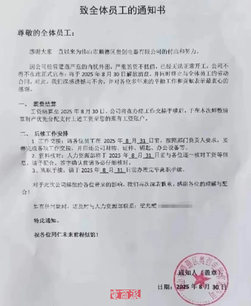 例如在8月底,佛山市顺德区奥创电器有限公司就正式发布解散公告,原因是“严重资不抵债、无法正常开工”,宣布即日终止运营,并与全体员工解除劳动合同。在公告中也能看出企业的无奈,“对此,我们深感遗憾和不舍,并对各位多年来的辛勤工作和贡献表示最衷心的感谢!”