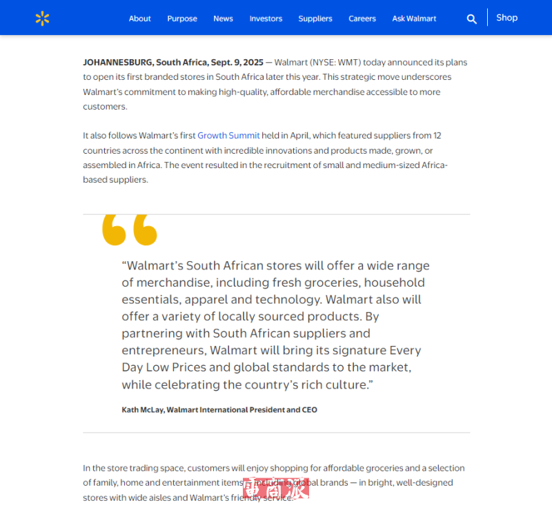 沃尔玛进军南非市场 年底前开设首批自有品牌门店