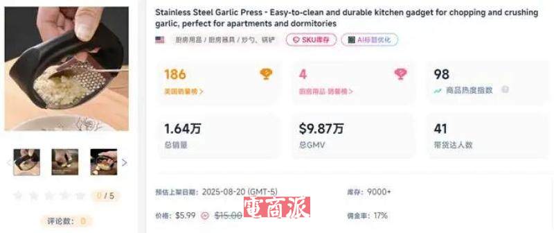 比如前段时间,在TikTok Shop美区,就有这样一款功能单一,但实用性超强的压蒜器卖爆了,一周内销量近6000件,直接冲上厨房类目销量榜第四,达成销售额约3.5万美元(约合25万人民币)。