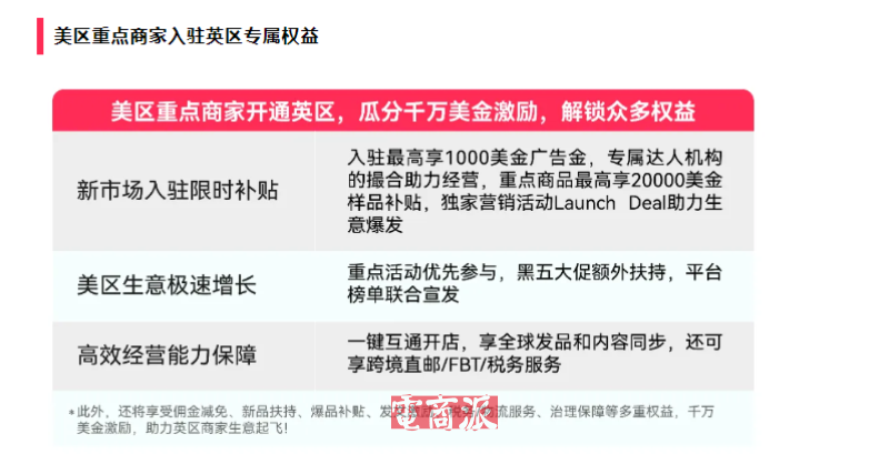 TikTok Shop美区重点商家,有亚马逊平台运营经验的重点跨境商家,入驻后即可享受平台为重点商家定制的一系列专属权益与专项扶持,帮助解决头部商家经营卡点,助力商家长期健康经营。重点商家专属权益包括:货品补贴、服务商优惠、内容权益等。