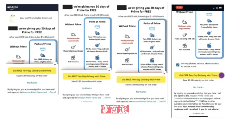 当时,FTC指控亚马逊违反了《联邦贸易委员会法案》和《恢复网上购物者信心法案》,因为亚马逊使用了具有欺骗性的界面,诱导消费者在不知情的情况下注册Prime会员。同时,亚马逊增加了取消订阅流程,以阻止或延迟消费者取消Prime会员服务。