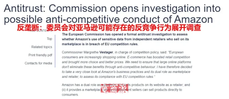 欧盟委员会对亚马逊展开审查 图源:ec.europa.eu