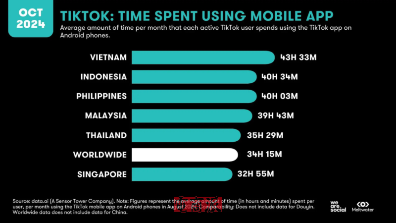 首先TikTok在东南亚已远不止是一个短视频应用,它深度融入了年轻一代的日常生活,成为娱乐、社交和信息获取的中心场域。据Meltwater和We Are Social联合发布的《2024年全球数字报告》数据显示,东南亚用户月均使用TikTok时长超35小时,远超全球平均水平。
