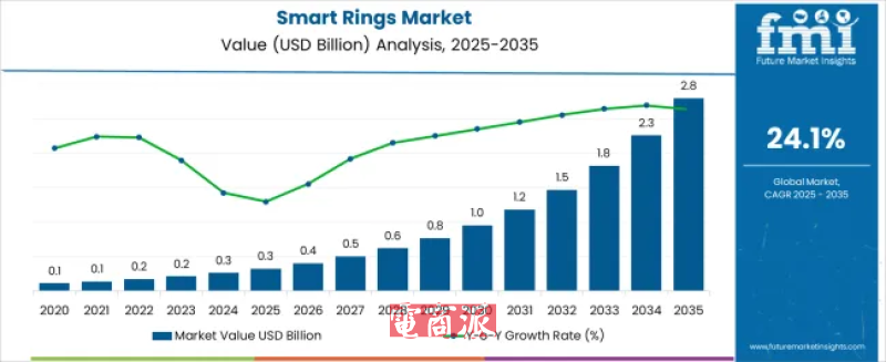 FutureMarketInsights数据显示,预计2025年,全球智能戒指市场估值将达到3亿美元,并有望在2035年增至28亿美元,预测期间的复合年增长率(CAGR)约为24.1%。