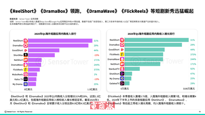 移动应用分析平台Sensor Tower的数据显示,2025年一季度,全球短剧内购收入增至近7亿美元,市场规模扩大近4倍。其中,头部短剧出海应用ReelShort和DramaBox内购收入分别为1.3亿美元和1.2亿美元,包揽海外短剧应用收入榜和增长榜冠亚军。