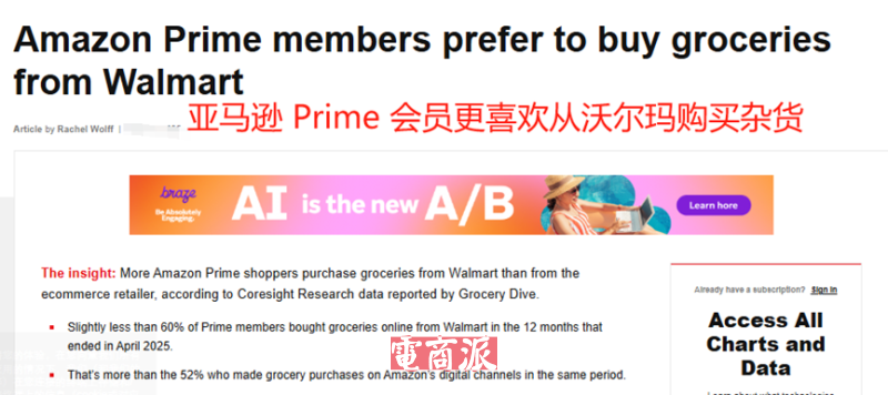 据Coresight Research的一项调研显示,在截至2025年4月的12个月内,近58%的Prime会员在网上购买杂货时会选择沃尔玛,高于选择亚马逊的比例(52%)。