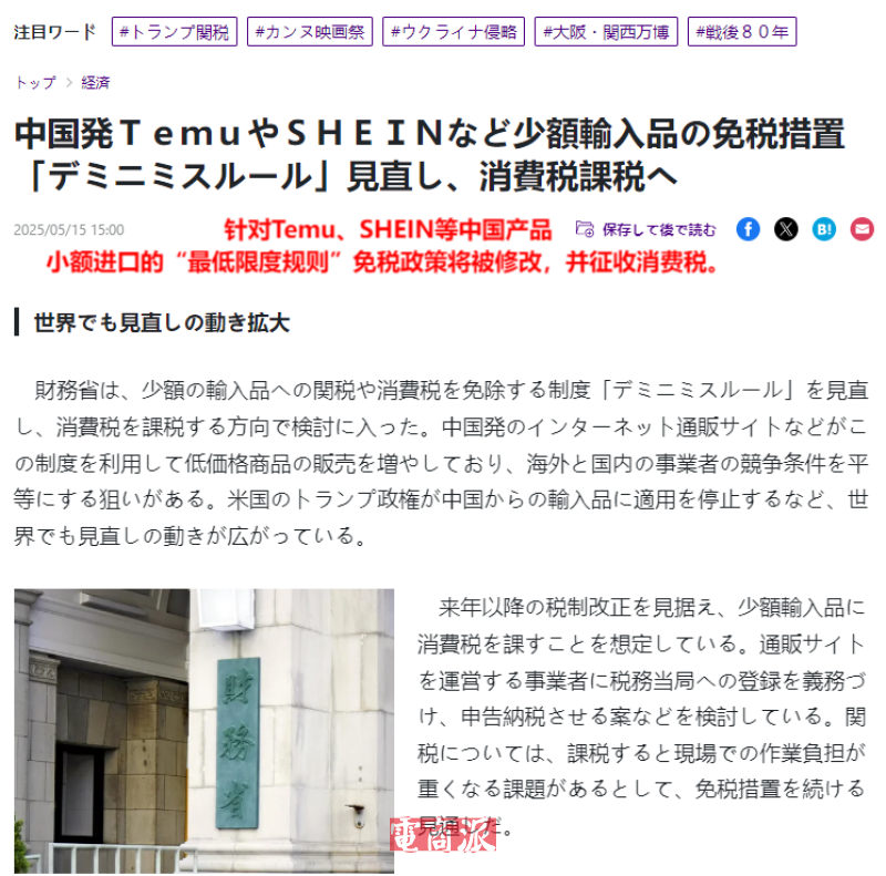 不过,值得关注的是,今年日本市场释放出监管收紧信号,日本财政部表示将考虑调整进口小额商品的免税政策,并对这些商品加收消费税,预计2026年将制定出详细的税收新规。目前,进入日本的价值低于1万日元(约合人民币466.32元)的国际商品免征关税和消费税。