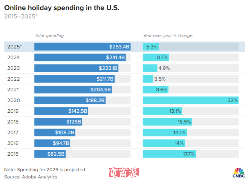 美国假日季在线消费额增长 图源:CNBC