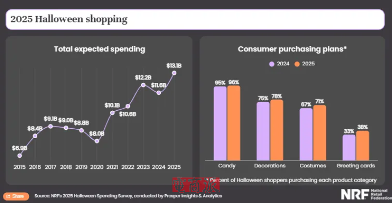 据美国零售联合会(National Retail Federation)由Prosper Insights & Analytics进行的年度消费者调查显示,今年万圣节的消费预计将达到创纪录的131亿美元,家居装饰类产品需求最为旺盛。