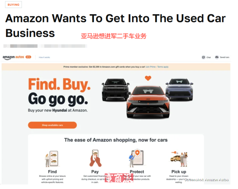 近期来看,不得不提的就是亚马逊拓展线上卖车了。今年上半年亚马逊汽车部门主管Fan Jin就透露,亚马逊将很快进入二手车市场,帮助经销商销售二手车。到了8月,亚马逊宣布在洛杉矶联合现代经销商试点二手车及认证二手车销售,正式进军万亿级汽车交易市场。