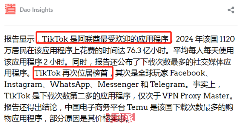 此前Sensor Tower 发布的《移动应用状态报告》显示,TikTok已成为阿联酋最受欢迎和最常下载的社交媒体应用:2024年,TikTok在阿联酋新增了250万用户,同比增幅达30.4%,累计有1120万居民活跃在该平台。