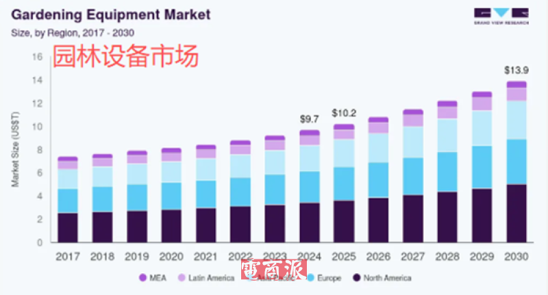 Grand View Research的数据显示,2024年全球园艺设备市场规模约为968.6亿美元,预计到2030年将达到1389亿美元,复合年增长率达到6.3%。