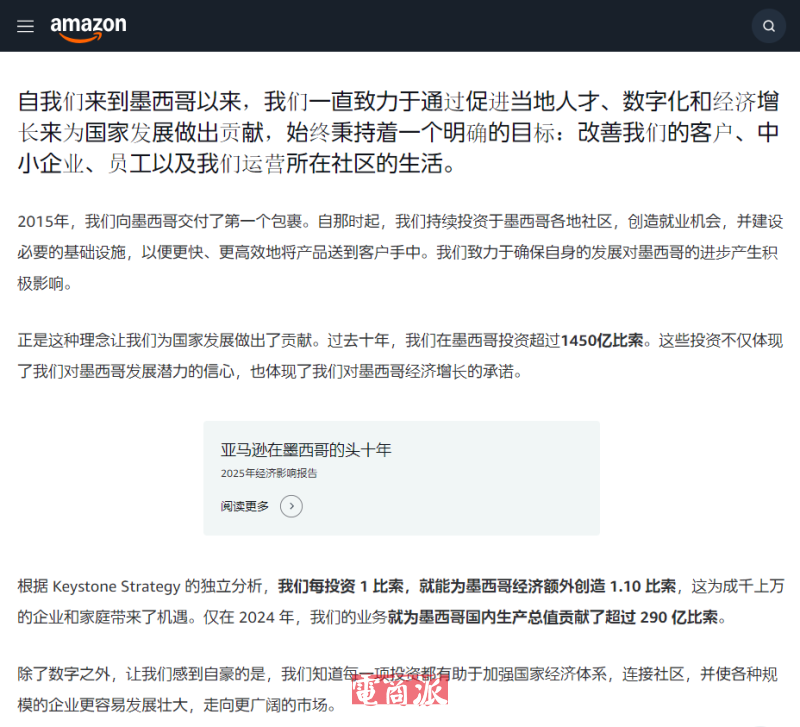 11月11日消息,亚马逊墨西哥在运营十周年之际发布了第三版《经济影响报告》,总结过去十年在投资、就业、数字化与社区支持等方面的具体数据。自2015年进入墨西哥以来,亚马逊累计投资超过1450亿比索。独立研究机构Keystone Strategy测算显示,每投入1比索可为墨西哥经济带来约1.10比索的附加产出;仅2024年,亚马逊业务对墨西哥全国GDP的贡献就超过290亿比索。