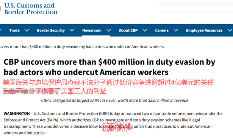 根据美国海关和边境保护局披露的数据,今年1月至8月,通过EAPA反规避程序追缴和揭露的未缴税额已经超过4亿美元,涉及虚假审包、伪造文件、产地虚标等多个环节。