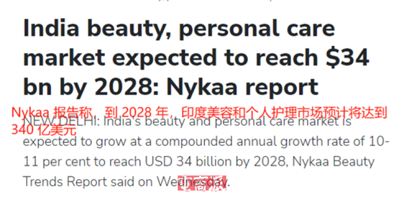 Nykaa此前发布了一份印度市场美容趋势报告,报告指出,印度美妆行业正在加速发展,成为全球增长最快的在线美妆市场。目前,印度美容和个人护理市场价值已达到280亿美元,预计到2028年这一数值将增长至340亿美元,预测期内的复合年增长率约为10%-11%。