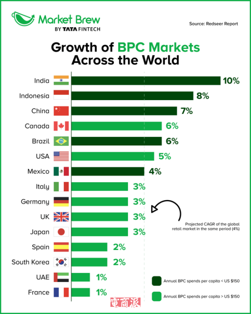 无独有偶,全球战略顾问公司Redseer也发布报告指出,印度有望成为全球范围内增长最快的美妆市场——在2022年至2027年期间,印度美妆个护市场将以10%的年复合率保持快速增长,预计到2027年规模将达到300亿美元。