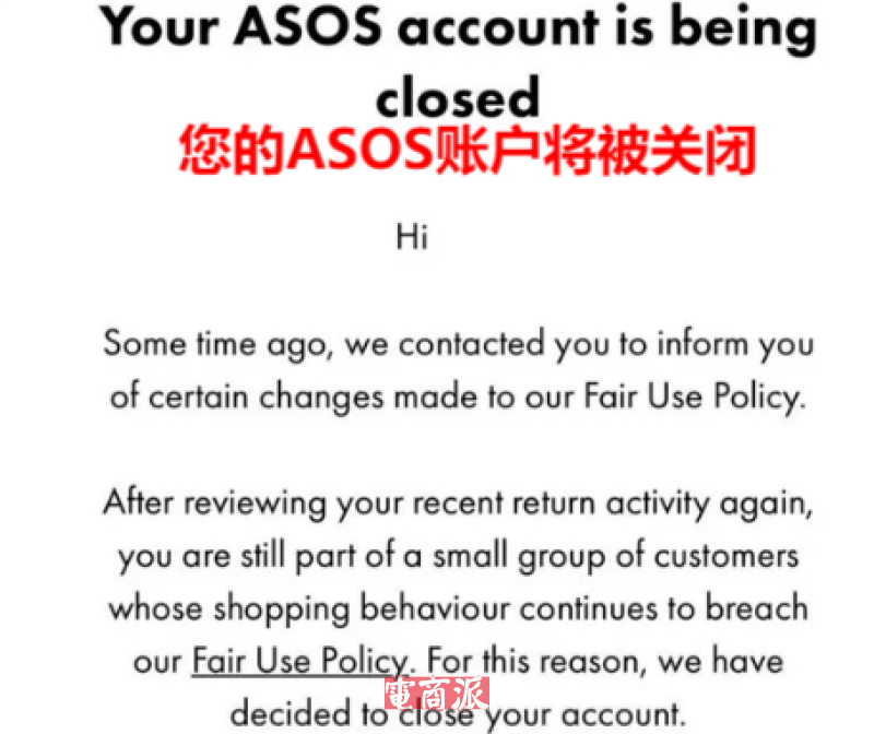 今年年中,英国时尚巨头ASOS便高调“处理”了一批高退货率顾客。具体做法是给这些顾客发送邮件,提示他们违反了平台的合理退货规则,因此平台将在30天内封禁他们的买家账户,即使这些顾客重新创建账户也会被平台继续屏蔽。