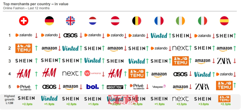 其中SHEIN在过去12个月中,Shein的市场份额显著上升,在德国、英国、荷兰、意大利等国均跻身前三,增幅最高达3%;Temu则通过极具竞争力的价格策略和高频营销,在西班牙等南欧市场实现快速增长,增幅达到2.3%。