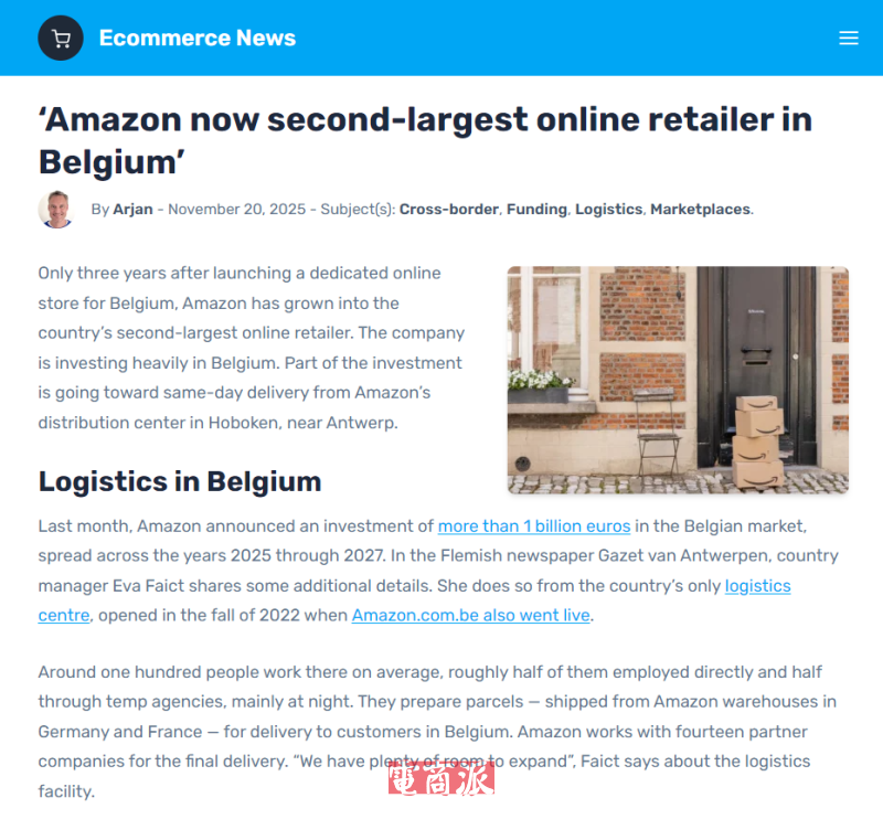 亚马逊表示,比利时的物流设施仍有较大扩展空间。为了以丰富的商品选择、低价与快速交付吸引更多比利时消费者,上个月,亚马逊宣布将在2025年至2027年间向比利时市场投资超过10亿欧元,以扩大业务与履约能力,并在三年内向荷兰投资超过14亿欧元。