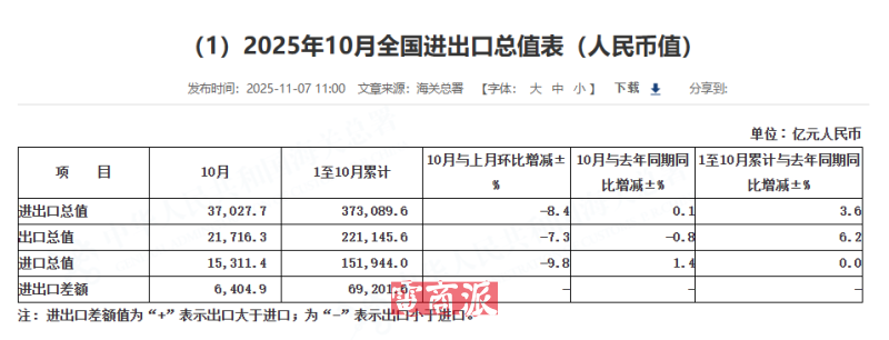 不久前,我国海关总署公布了截至今年10份的进出口数据。数据显示,2025年前10个月,我国进出口总值37.31万亿元人民币,同比增长3.6%,其中出口22.12万亿元,增长6.2%;进口15.19万亿元,与去年同期基本持平。