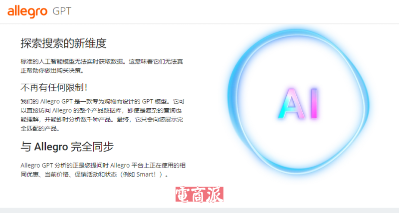 12月5日消息,波兰电商平台Allegro近日宣布,正式推出基ChatGPT的AI购物工具Allegro GPT,为用户提供更便捷的商品搜索与推荐服务,并为平台卖家带来新的曝光渠道。Allegro GPT将直接连接ChatGPT与Allegro.pl的API,使用户能够在对话中即时获得基于平台实时商品数据的推荐,无需额外订阅任何付费版本的ChatGPT。目前该功能已处于公开测试(beta)阶段,所有用户均可直接使用。
