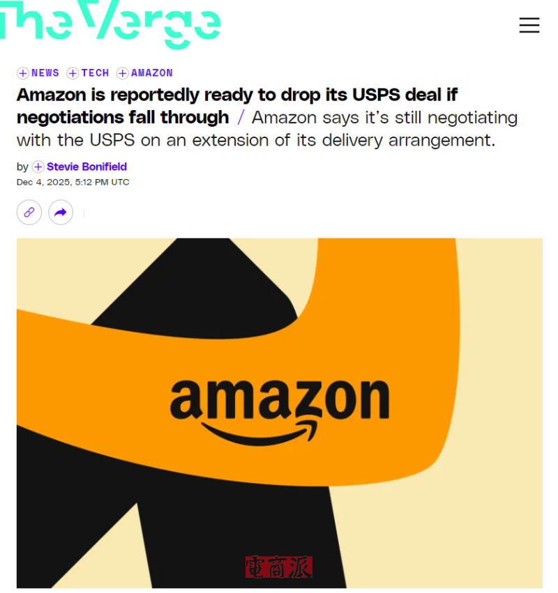 12月7日消息,亚马逊确认与美国邮政(USPS)续约的谈判出现停滞。市场消息指出,若谈判最终破裂,亚马逊可能结束双方超过30年的合作,转而进一步扩大自有配送网络。据悉,此次谈判僵局与USPS局长David Steiner计划在明年初启动“最后一英里配送合约竞拍”有关,这意味着亚马逊需与其他全美零售商及区域物流企业竞争USPS的配送资源。