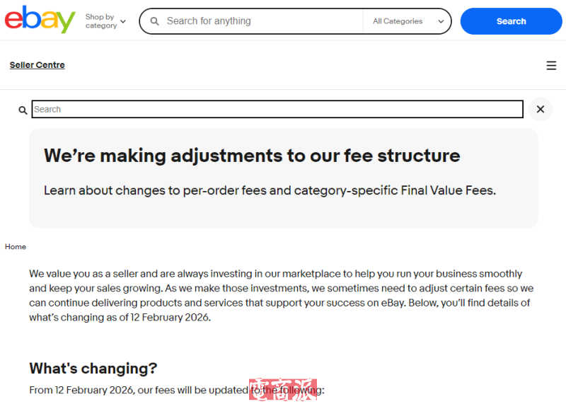 1月16日消息,eBay宣布,自2026年2月12日起,将对英国站点的企业卖家实施一系列费用调整,涉及按订单收取的成交服务费以及部分商品类目的成交服务费比例。eBay表示,此次调整旨在配合平台持续投入,以支持卖家经营和销售增长。