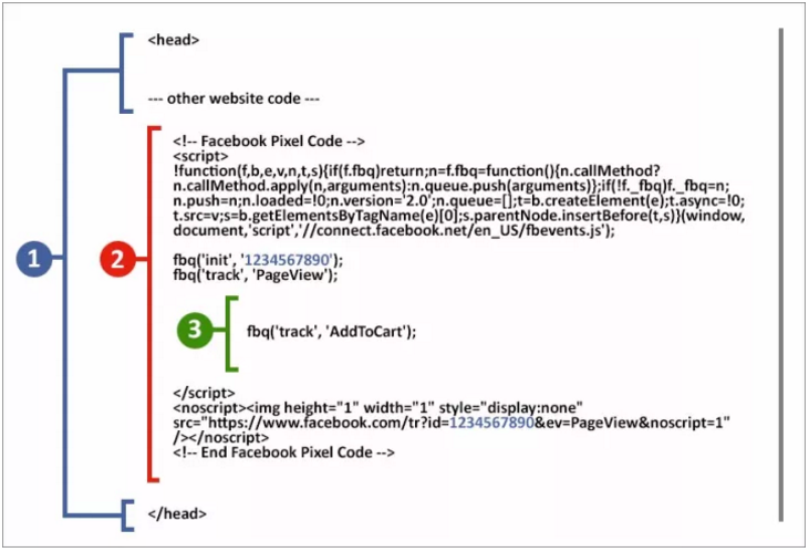 第一部分(蓝色)为网站的原始代码: 将Facebook像素代码粘贴至网页的标签之间。