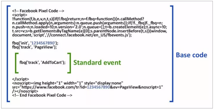 第三部分为标准事件代码(绿色): 将与您的页面相关的标准事件代码(例如:加入购物车代码)粘贴至 Facebook 像素代码中 标签上方。你只需要在想要追踪的每个页面上操作就行了。