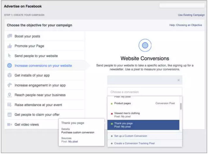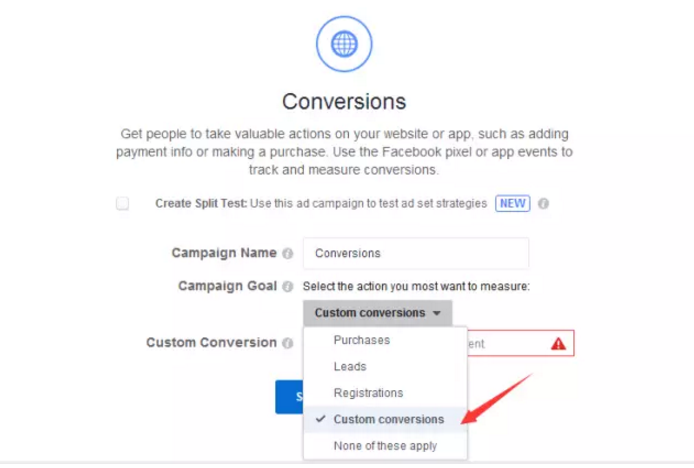 另外各位在设置Facebook广告的时候,可以看到,Campaign Goal中的Custom conversion,必须完成Custom conversion才能进行下一步,如下图,