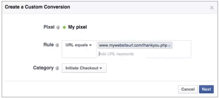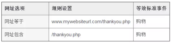 其中添加代表自定义转化的网址或部分网址(例如:购物之后的感谢页面,网址包含 /thankyou.php)。这相当于使用购物标准事件。如果使用网址等于,还应确保包含域名(例如:www)。无需包含“http”或“https”。详情如下: