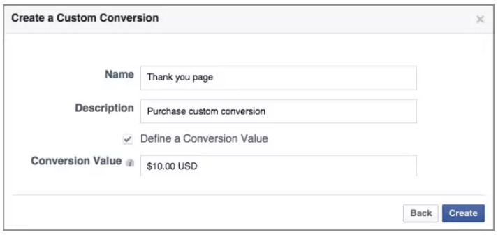 如适用,添加转化价值(例如:如果出售价值 $10 美元的门票,在这里输入 $10)。添加转化价值后,您可以在报告中查看广告花费回报。点击创建 > 完成