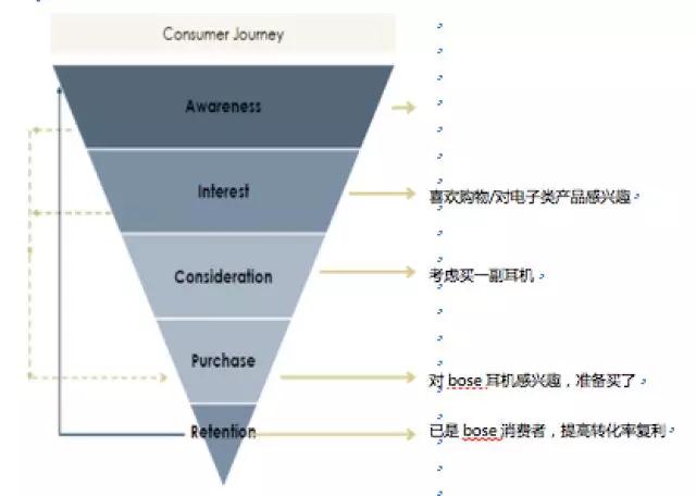 凭借品牌的影响力吸引消费者,消费者的行为方式呈现一个漏斗的形态。