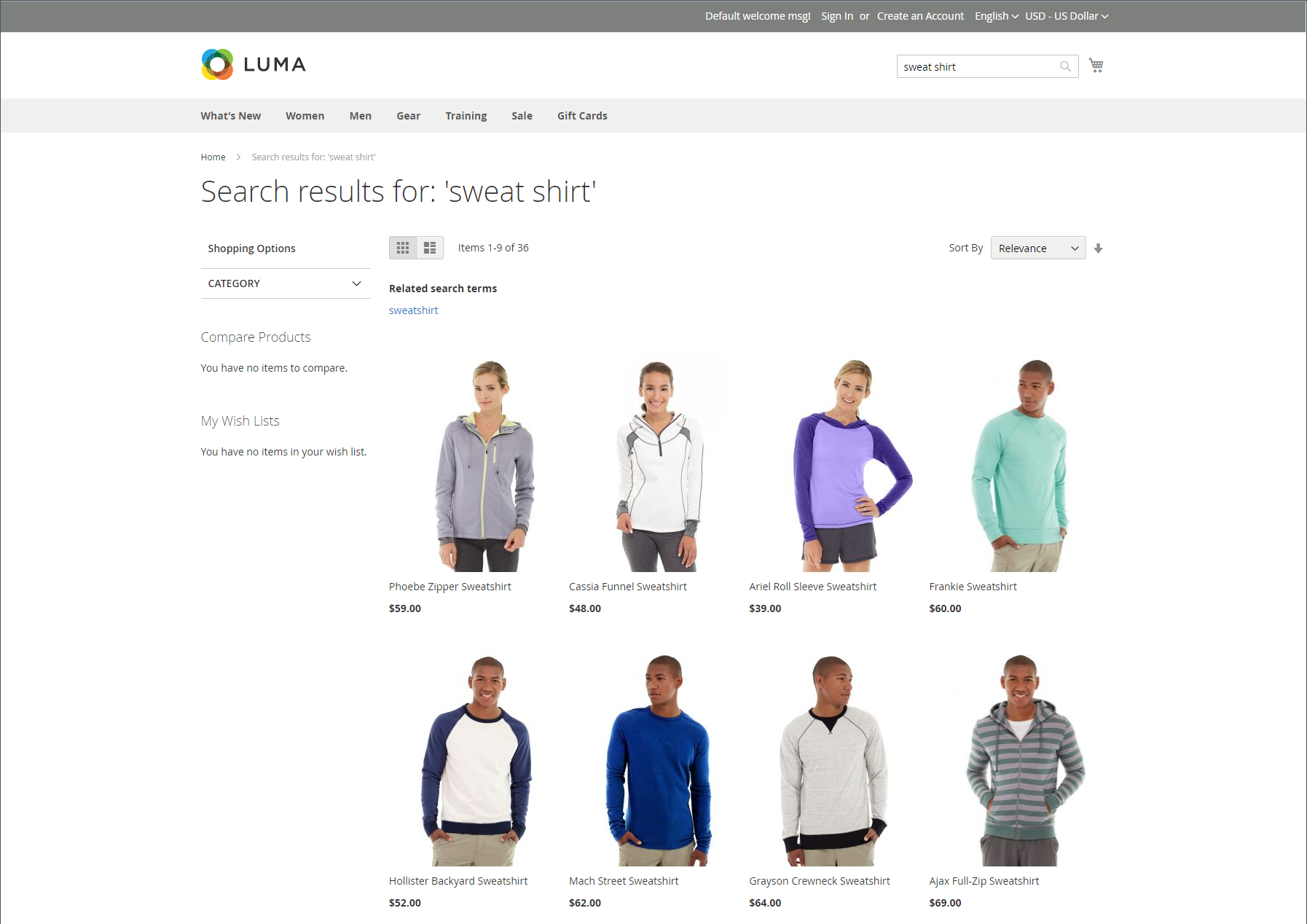 - 标准搜索同义词功能(如本页所述)对于所有 Adobe Commerce 安装都是开箱即用的。